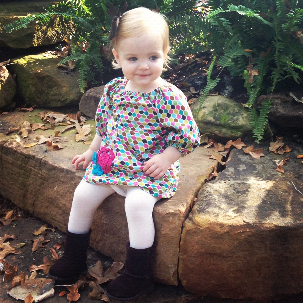 She does not love/hates anything on her head. Headbands, bows, hats...I know the ponytail is silly, but it is the only option. By some miracle she wore this hood long enough for me to take a picture. And halfway smiled about it.